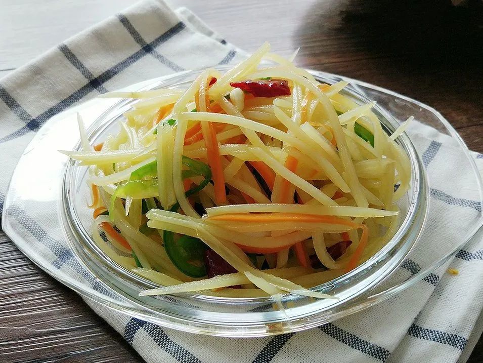 1、土豆和胡萝卜去皮切丝,并将土豆丝用凉水泡一会儿捞出