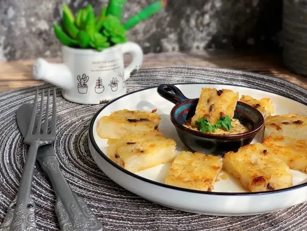 白萝卜300g、粘米粉100g、干香菇五朵、盐一勺、白胡椒粉半勺、酱油两勺