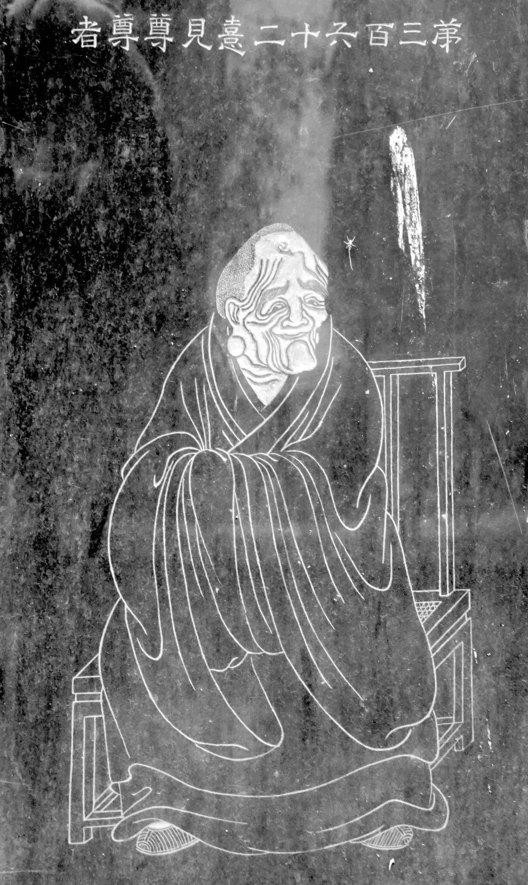 尊者法相所现为正面而坐,面容瘦削,双耳垂肩,双手笼于袖中。