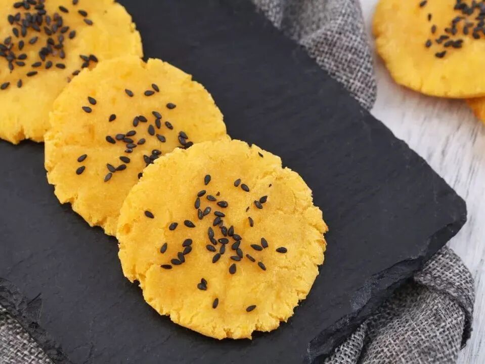 3、放入烤盘,表面刷一点水再撒上黑芝麻;将烤盘放入提前预热好的烤箱中,180度烘烤10分钟左右即可(根据饼的薄厚以及烤箱类型,调整温度及时间)