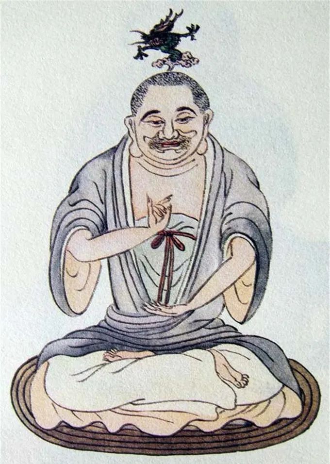 尊者法相所现为结跏趺坐,头顶一飞龙,双手于胸前结印。