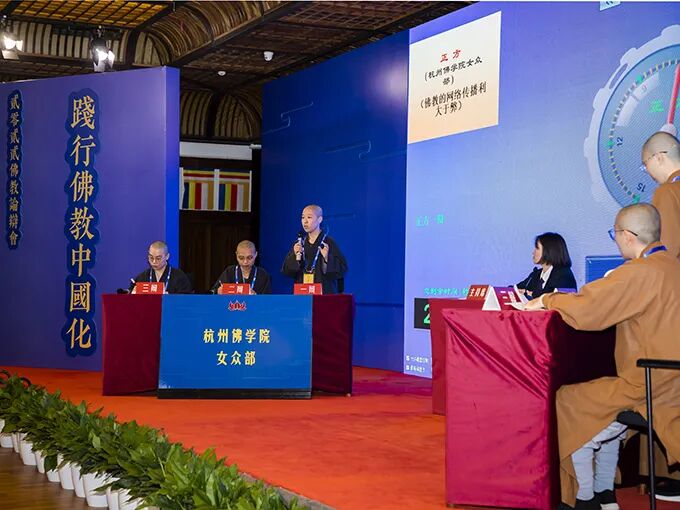 决赛第一场的论辩主题是“佛教中国化更应从三藏典籍中汲取营养还是更应从传统文化中汲取营养”。纵观佛教中国化的进程中,汉文大藏经是佛教与中国传统文化相结合的产物,相互融合、融会贯通,既推进了佛教在中国传统文化中的扎根与发展,也丰富、壮大了中国传统文化体系的建立与传承。中国佛教文化的发展历程,充分体现了中华文化兼容并蓄、吸收消化的特点。佛教是中华民族传统文化的瑰宝、是我们的使命,但传统文化亦是我们的传承与坚持。围绕着佛教中国化的主题,辩手们双方滔滔不绝,各据一势,时有机锋妙语,台下观众纷纷叫好,气氛热烈。