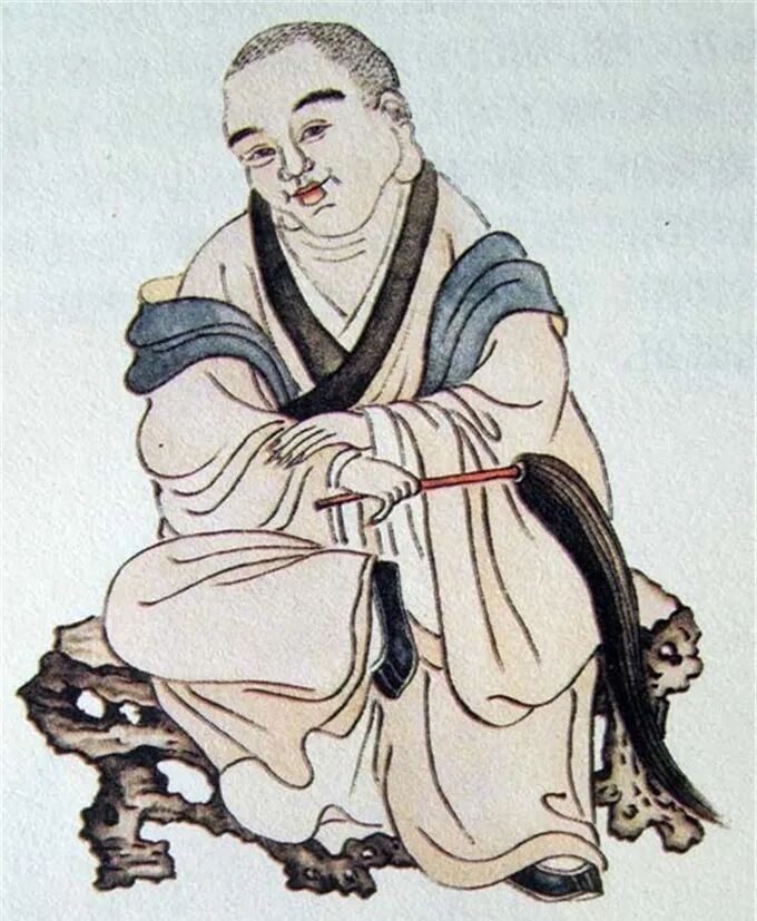 尊者法相所现为正面而坐,侧头微笑,右腿弯曲,右手执拂子。