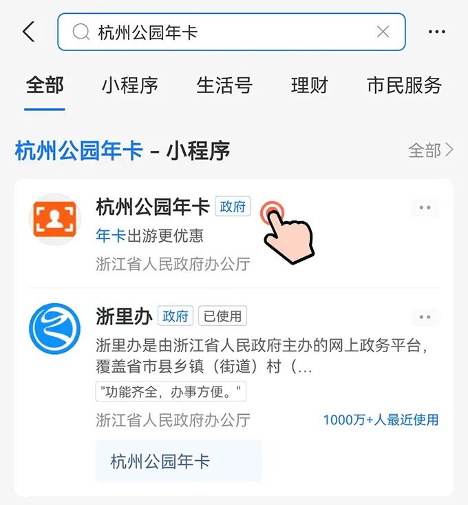 打开支付宝,搜索“杭州公园年卡”,选择杭州公园年卡——杭州市(市民中心),进入“浙里办”界面。
