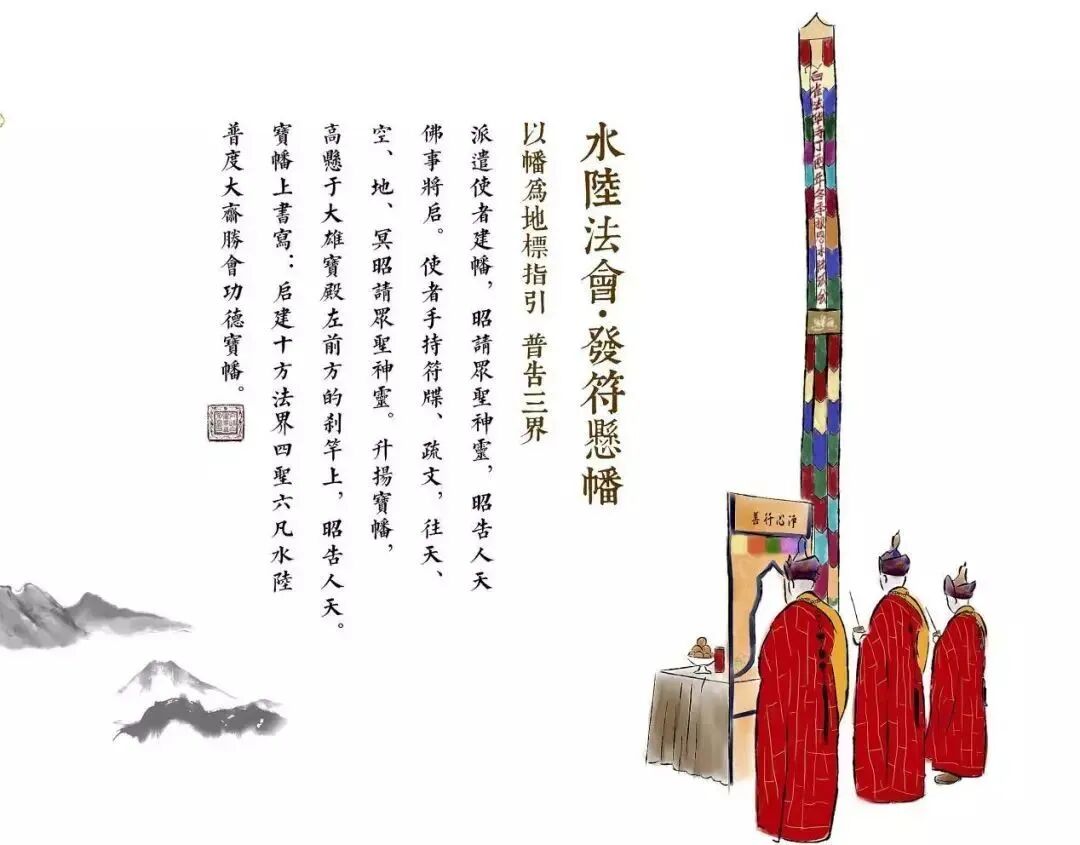 四大内修菩萨行,外现神王身的使者手持符牒、疏文,往天﹑空﹑地﹑冥去昭请众圣神灵后,升扬写着"启建十方法界四圣六凡水陆普度大斋胜会道场功德"的宝幡。