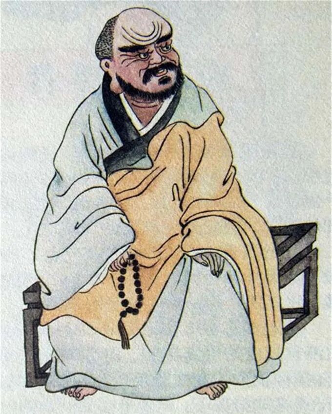 尊者法相所现为赤脚而坐,目视左方,右手持佛珠,左手置于左膝。