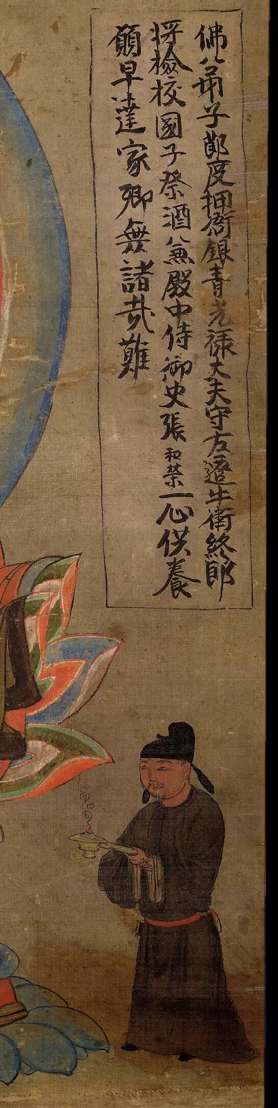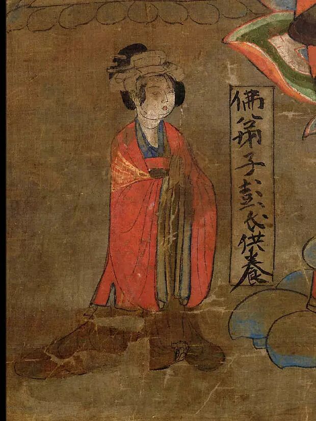 从榜题可以看出,此画为张和荣夫妻所绘制供养,张和荣当时为一守边将领,其供养药师佛的目的是“愿早达家乡,无诸哉(灾)难。”有资料显示张和荣曾在肃州镇守,从供养人像头上所戴的帽子看,应为晚唐时代。