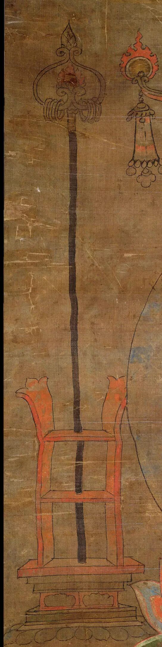 药师琉璃光如来头顶宝盖,法相慈悲安详,仪态庄严,乌发肉髻,双耳垂肩,著红色佛衣,坦胸露右臂,右手上举胸前结印,左手膝前捧药钵,双足跏趺于莲花宝座中央。右侧有锡杖安置于架上。此药师像是依不空译《药师如来念诵仪规》所绘。
