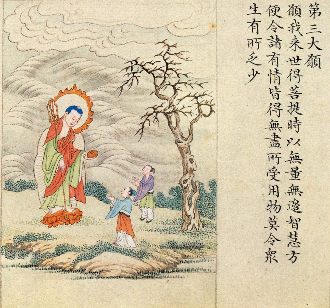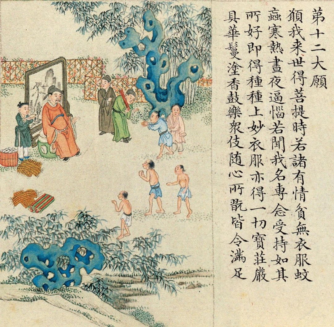 愿我来世得菩提时,若诸有情贫无衣服,蚊虻寒热昼夜逼恼,若闻我名专念受持,如其所好,即得种种上妙衣服,亦得一切宝庄严具、华鬘涂香、鼓乐众伎,随心所玩,皆令满足。