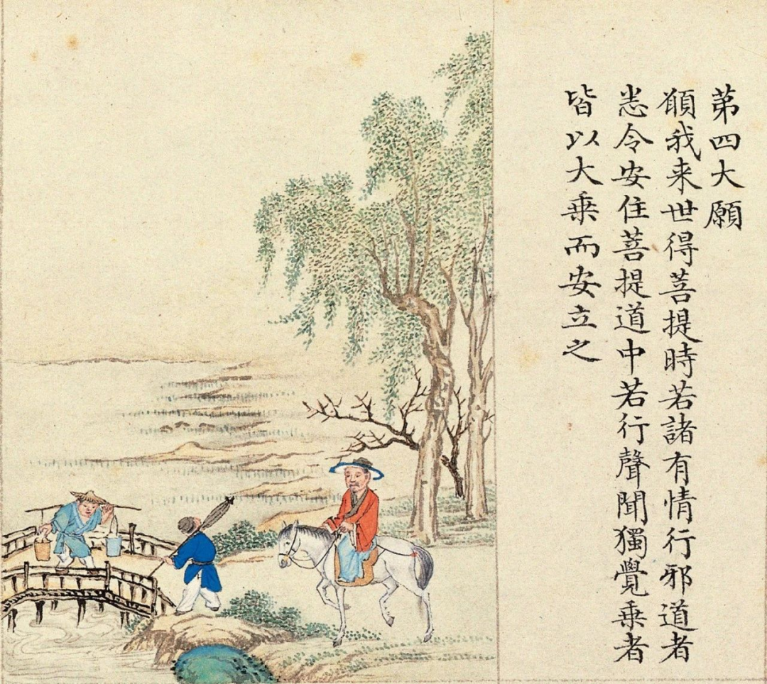 愿我来世得菩提时,若诸有情行邪道者,悉令安住菩提道中;若行声闻独觉乘者,皆以大乘而安立之。
