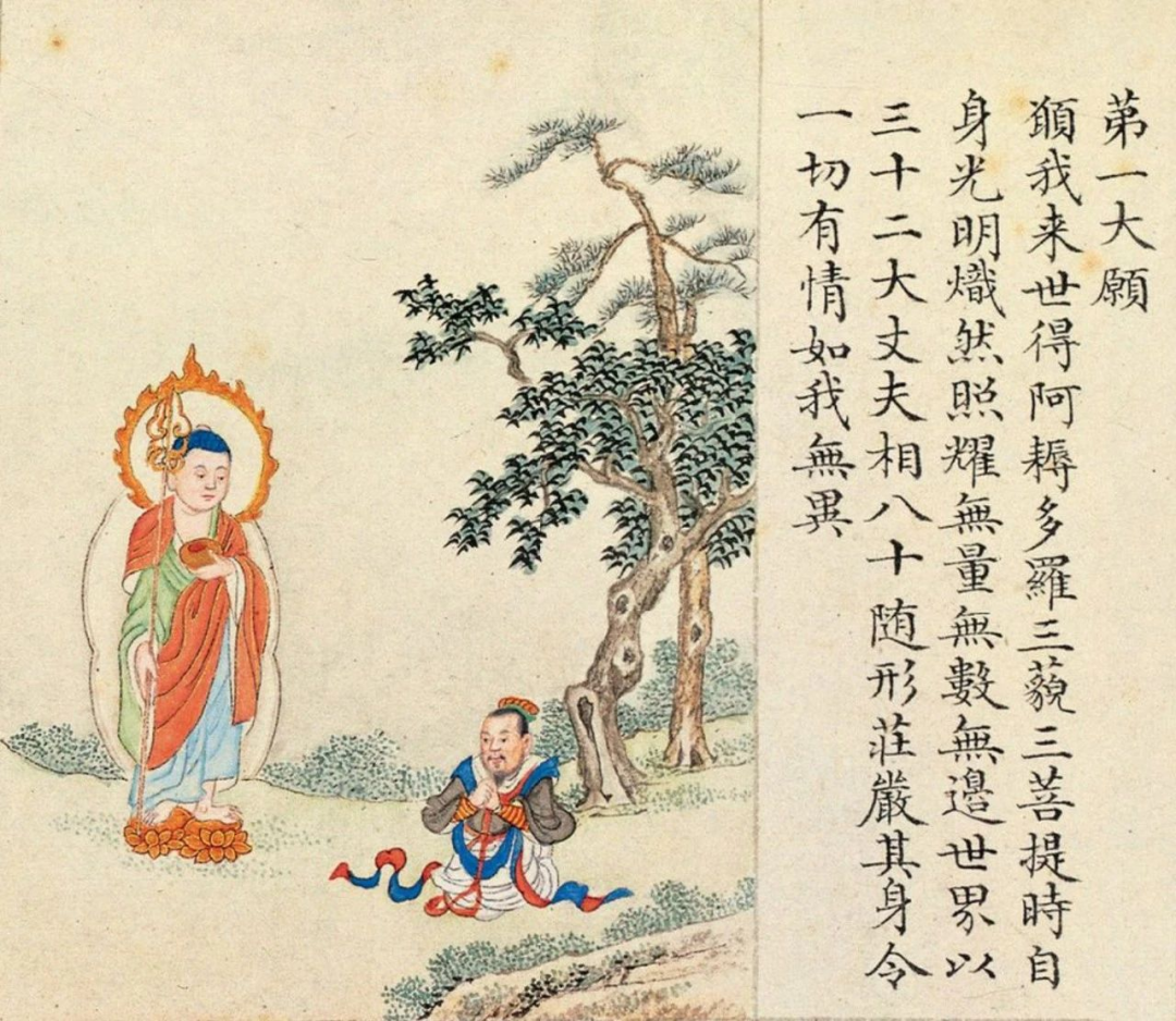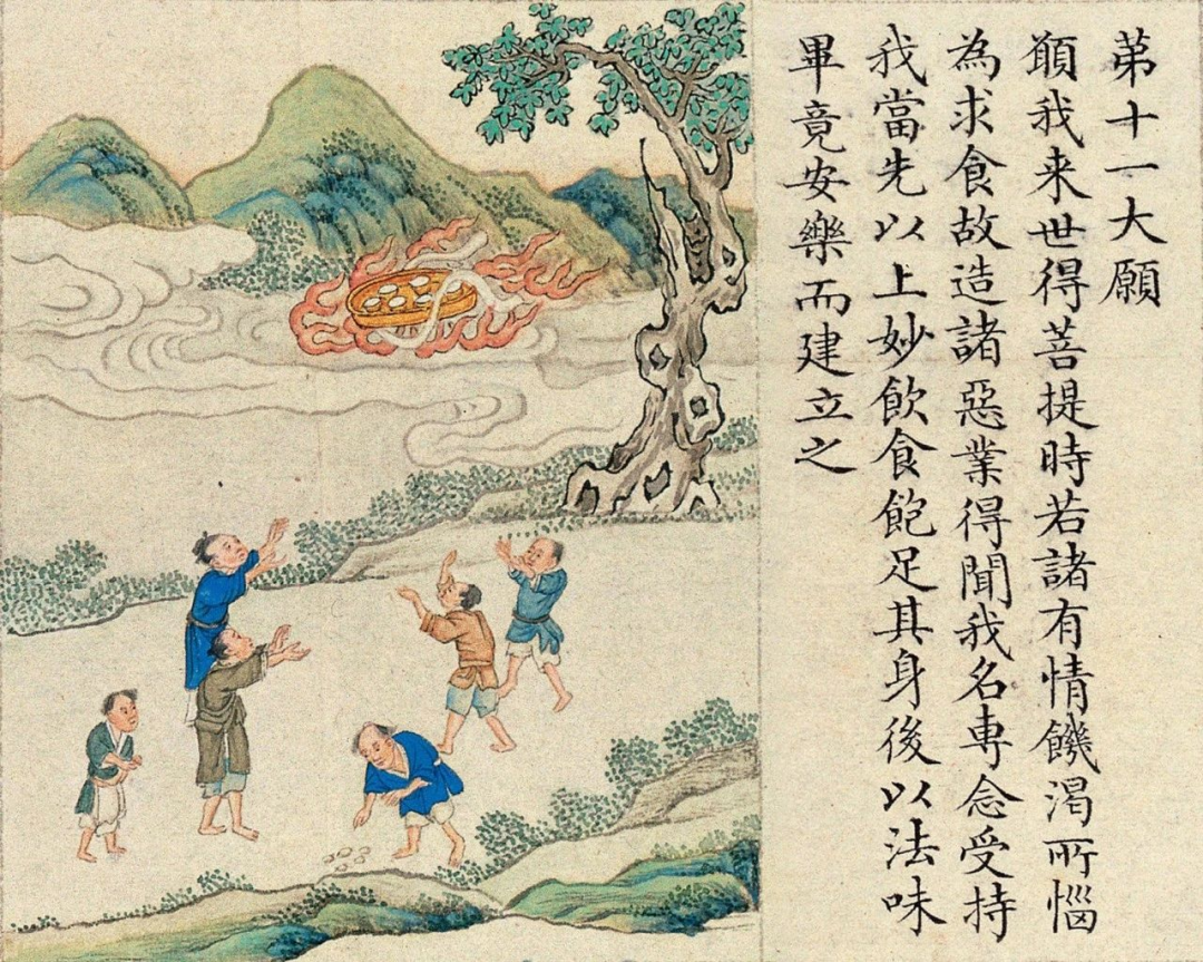 愿我来世得菩提时,若诸有情饥渴所恼,为求食故造诸恶业,得闻我名,专念受持,我当先以上妙饮食饱足其身,后以法味毕竟安乐而建立之。
