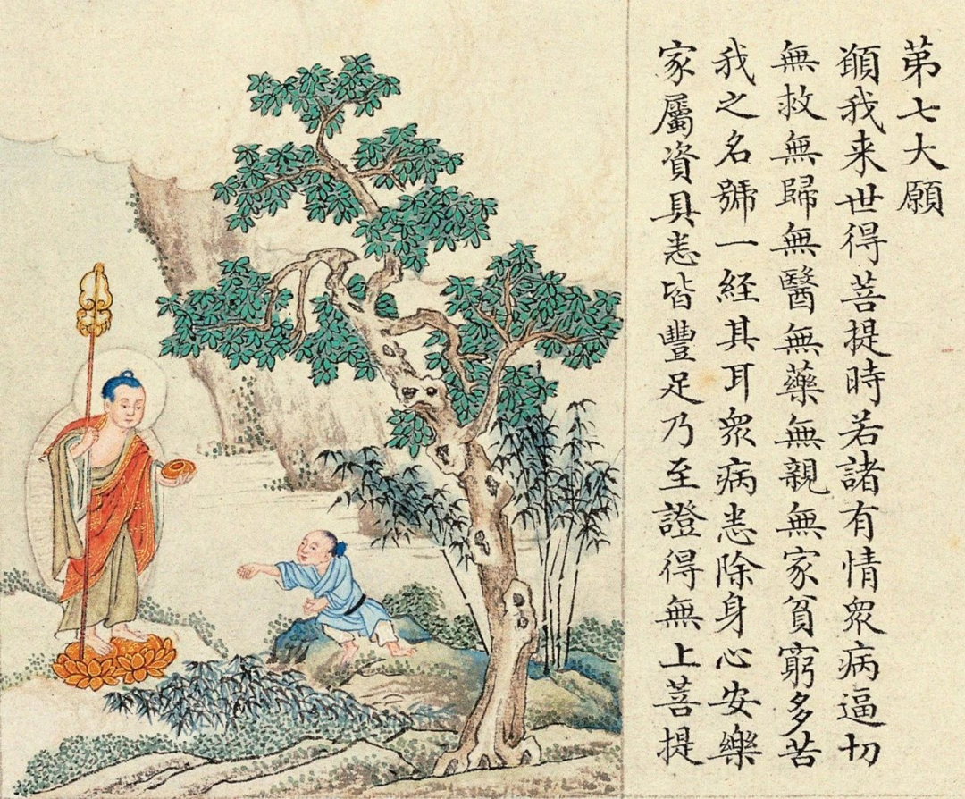 愿我来世得菩提时,若诸有情众病逼切,无救无归,无医无药,无亲无家,贫穷多苦。我之名号一经其耳,病悉得除,身心安乐,家属资具悉皆丰足,乃至证得无上菩提。