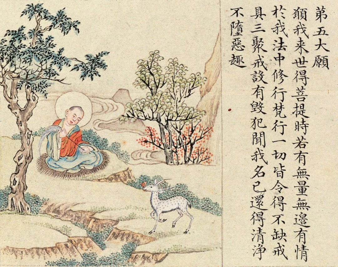 愿我来世得菩提时,若有无量无边有情,于我法中修行梵行,一切皆令得不缺戒,具三聚戒。设有毁犯,闻我名已,还得清净,不堕恶趣。