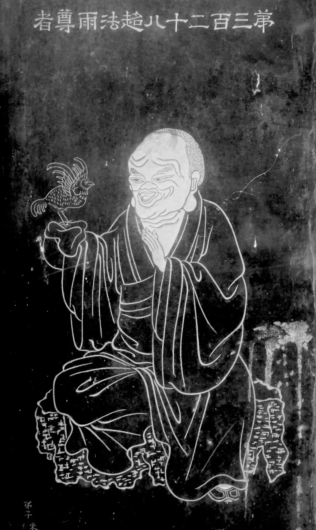 五百罗汉第叁佰贰拾捌尊超法雨尊者,即法雨菩萨,以雨来比喻佛之教法。佛法滋润众生,令由迷妄而至证悟,犹如雨之普泽草木,使其生长,而至开花结果,故以雨譬喻之。