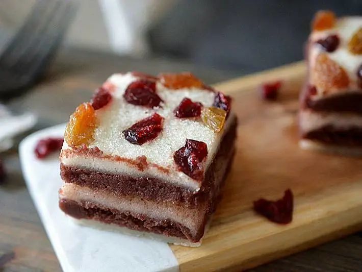 5、豆沙上面再过筛一层细粉,铺平后将蔓越莓和葡萄干均匀地撒在上面