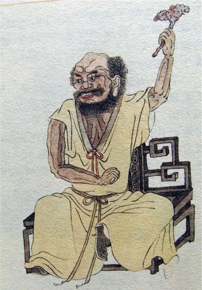 尊者法相所现为正面而坐,面露威严,浓须卷发,左手高举法器。
