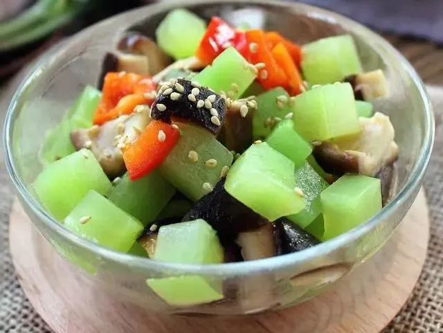 3、锅热,倒入适量油,炒香姜末,倒入莴笋丁与香菇丁,迅速翻炒2~3分钟