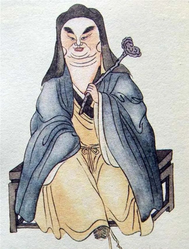 尊者法相所现为正面而坐,面露笑容,头戴风帽,右手持法器。
