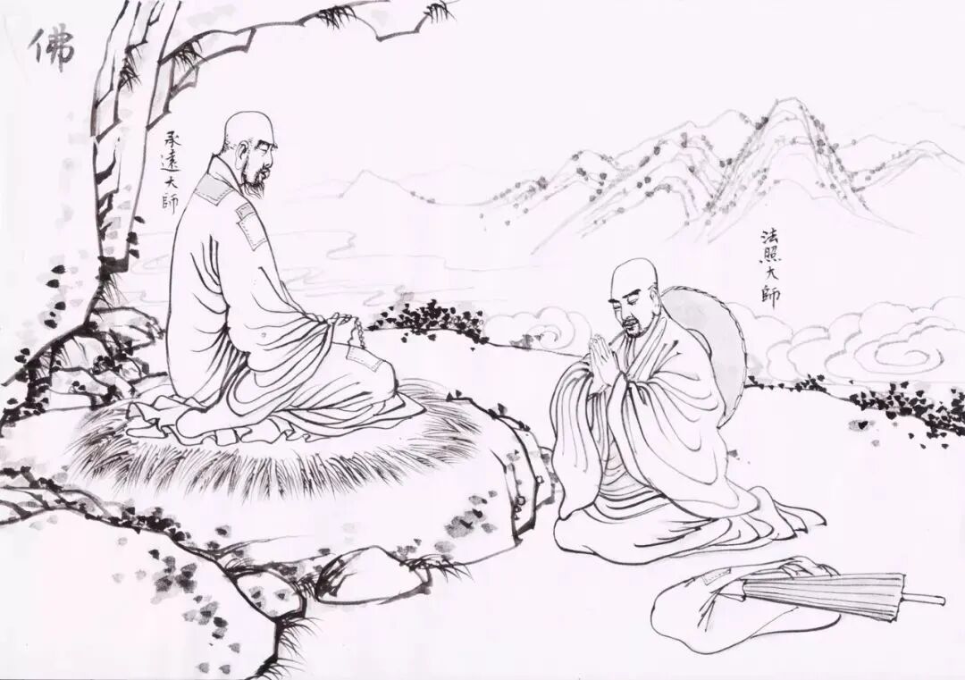 当时,法照大师在庐山修禅定。一日入定,往极乐世界,见一褴褛僧人侍立在佛侧,询知是南岳的承远大师。