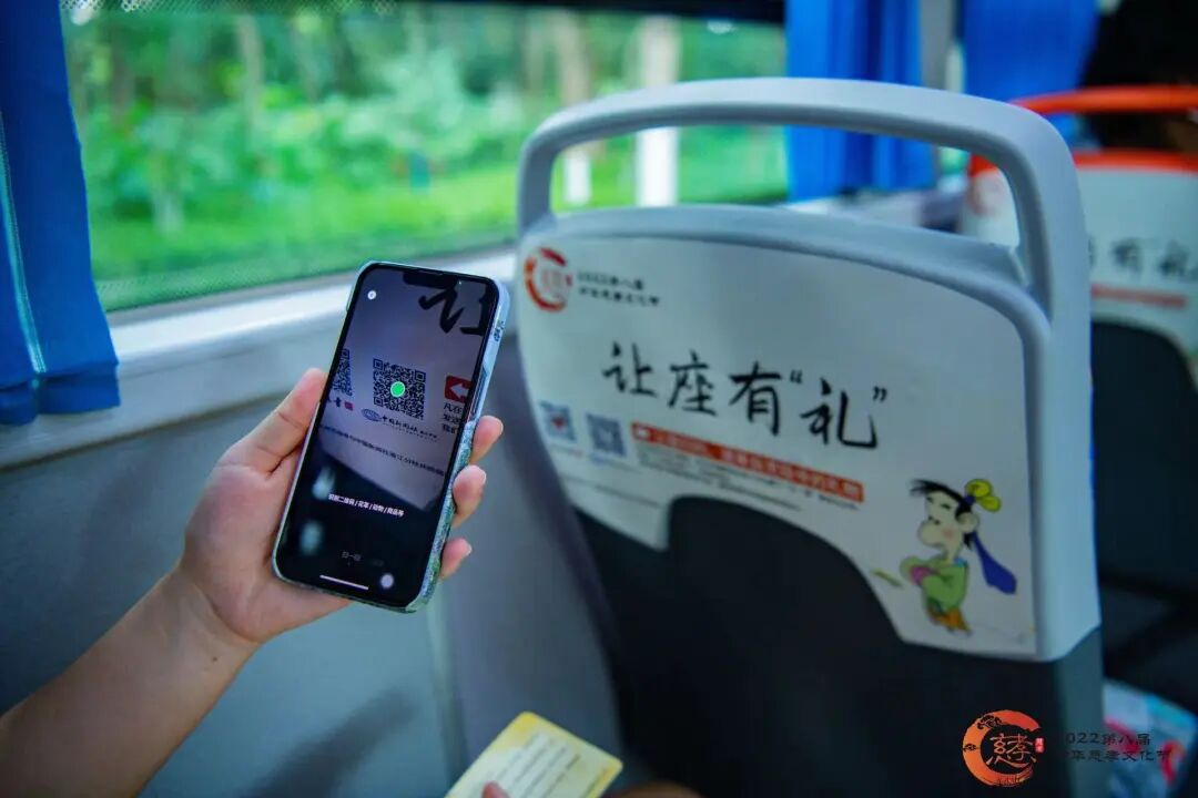 活动期间,在杭州26辆7路公交车上全线播报语音“中华慈孝文化节提醒您让座有‘礼’,扫一扫有惊喜!”并在其中20辆7路公交车下车位挡板处张贴可扫码的漫画, 扫码就有机会获得明信片,乘坐“慈孝公交”,还有机会获得中华慈孝公交纪念车票。