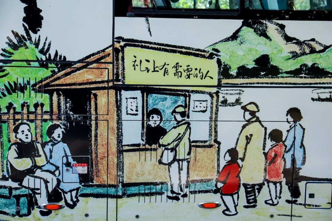 往年,“慈孝公交”车身用中国现代画家丰子恺的漫画布置,内容充满慈孝伦理之美。