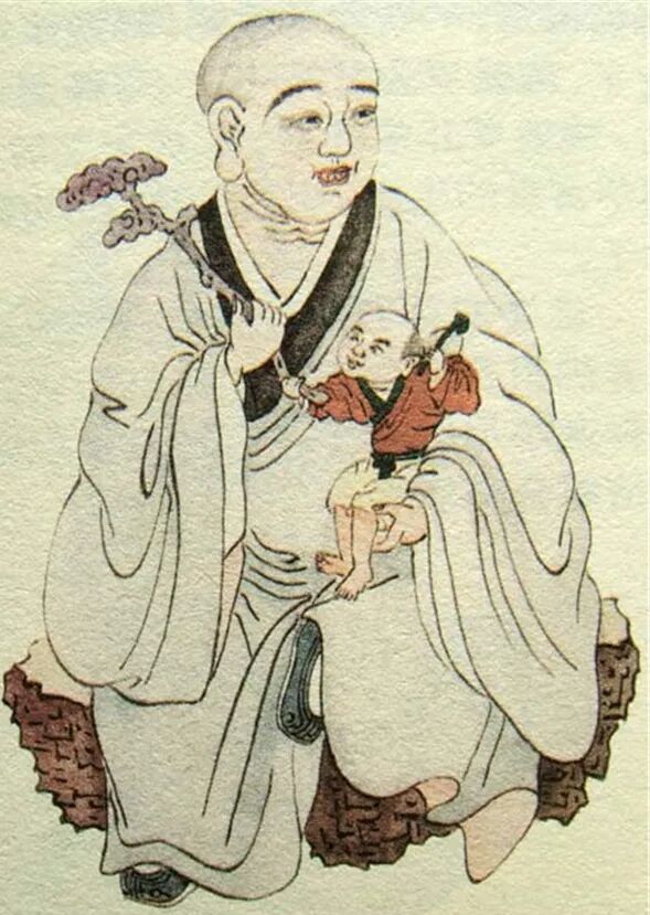 尊者法相所现为正面而坐,面露笑容,左手抱童子,右手持法物。