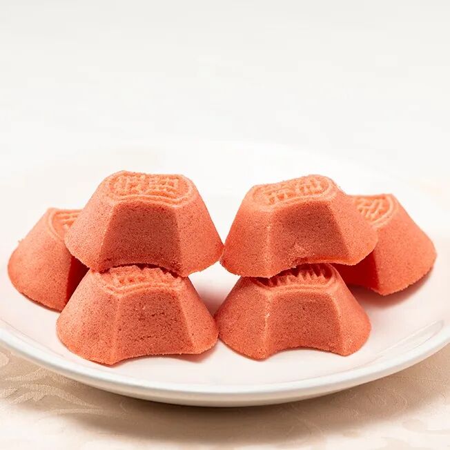 定胜糕色泽粉红,状如银锭,入口松软,豆沙甜糯,上有“定胜”二字,据说这是南宋时流行的美食,寓意着胜利凯旋。