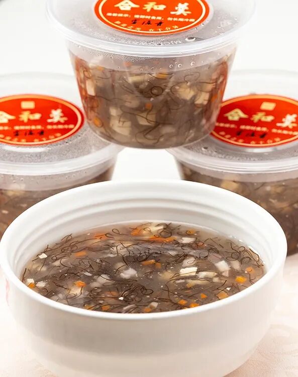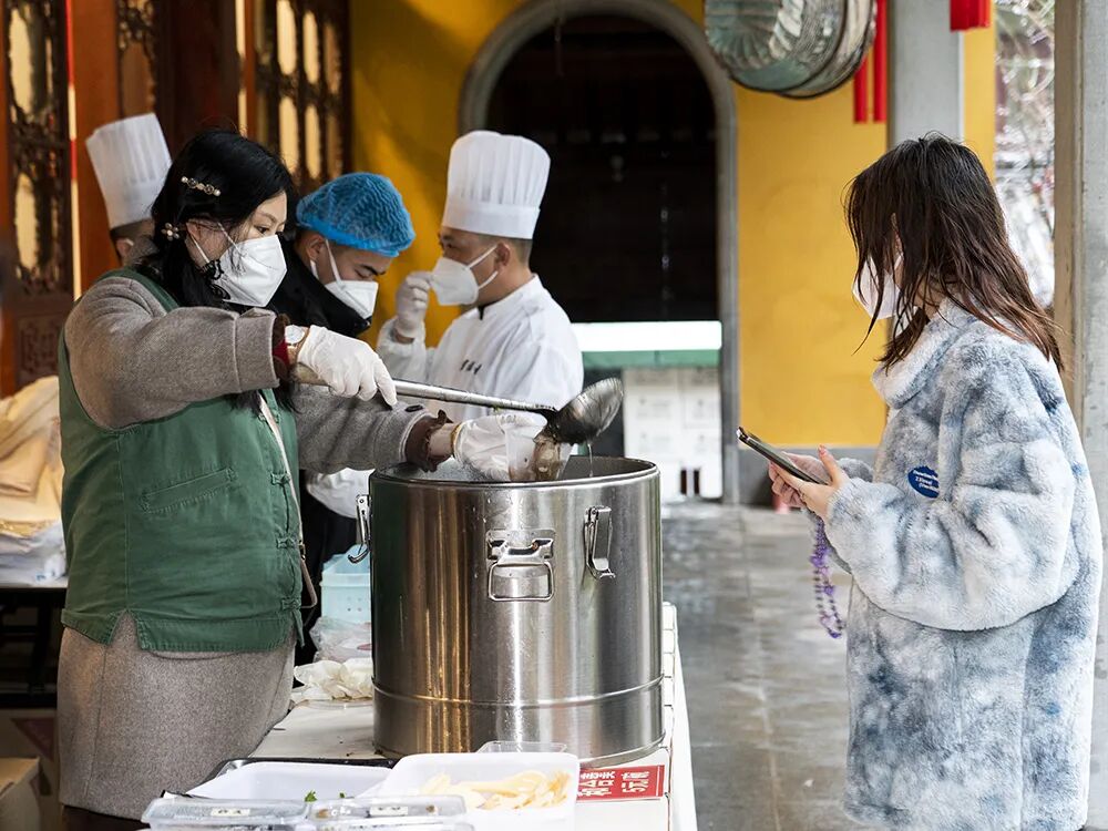 和合羹里面配有香芋、豆腐、发菜、香菇、胡萝卜丁等,羹汤爽滑、味道鲜美。佛教中的“和合”,指因缘的和谐聚合,寓意众缘和合,方能成事。