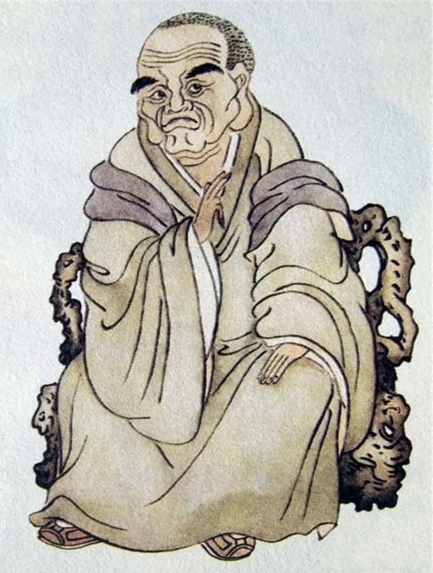 尊者法相所现为正面而坐,双耳垂肩,神态严肃,右手于胸前结印。