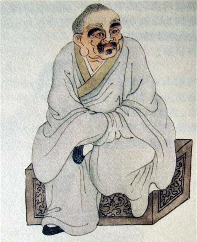 尊者法相所现为正面而坐,神态严肃,双手笼于袖中,左脚翘于右腿上。