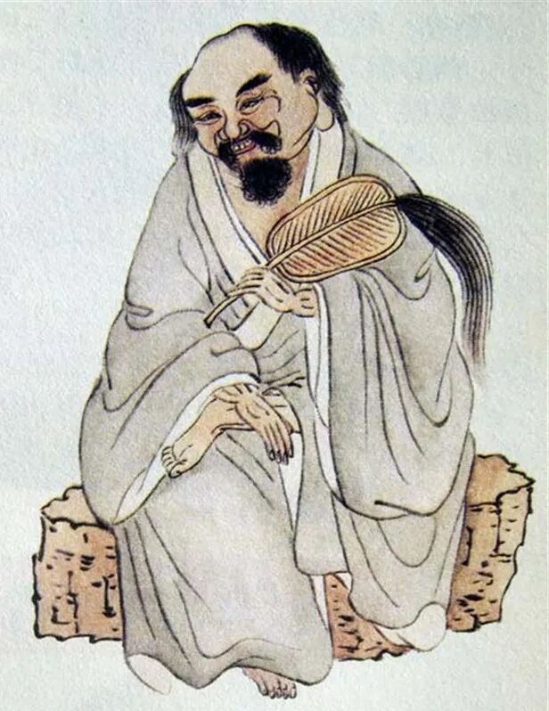 尊者法相所现为正面而坐,面露笑容,左脚翘于右腿上,左手持蒲扇。
