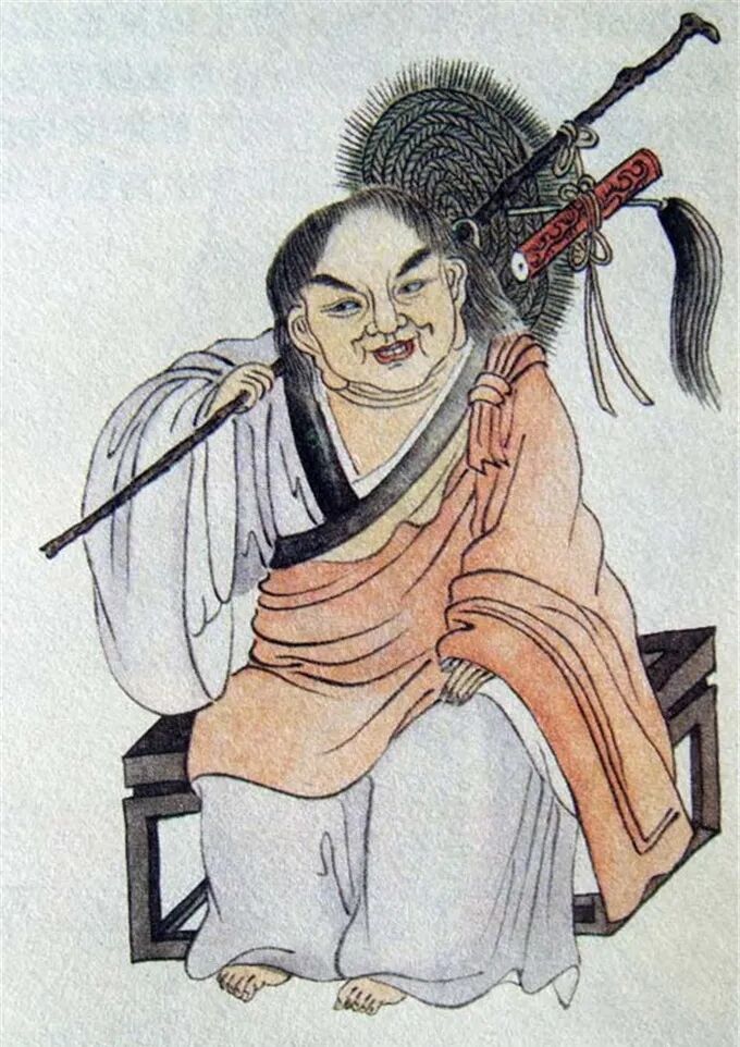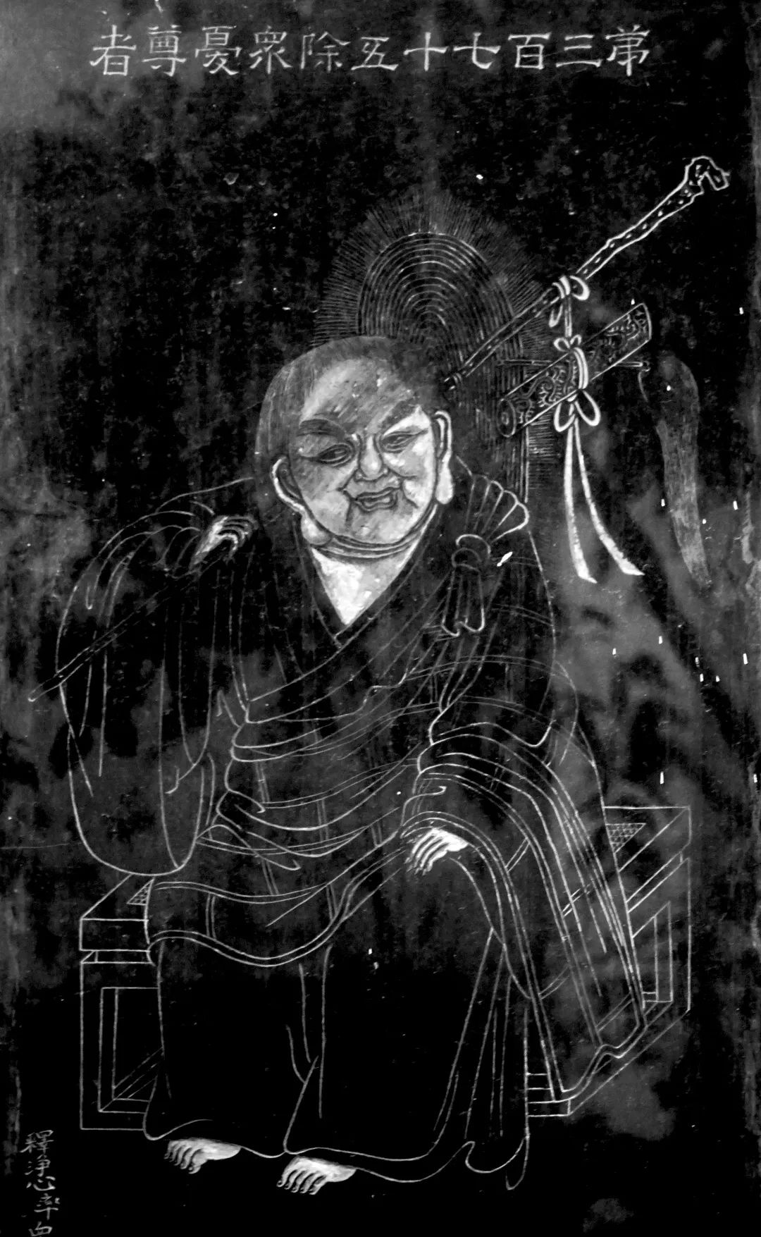 尊者法相所现为正面而坐,双耳垂肩,面露笑容,右肩扛一杖,杖上挂有经卷、拂子等法宝。