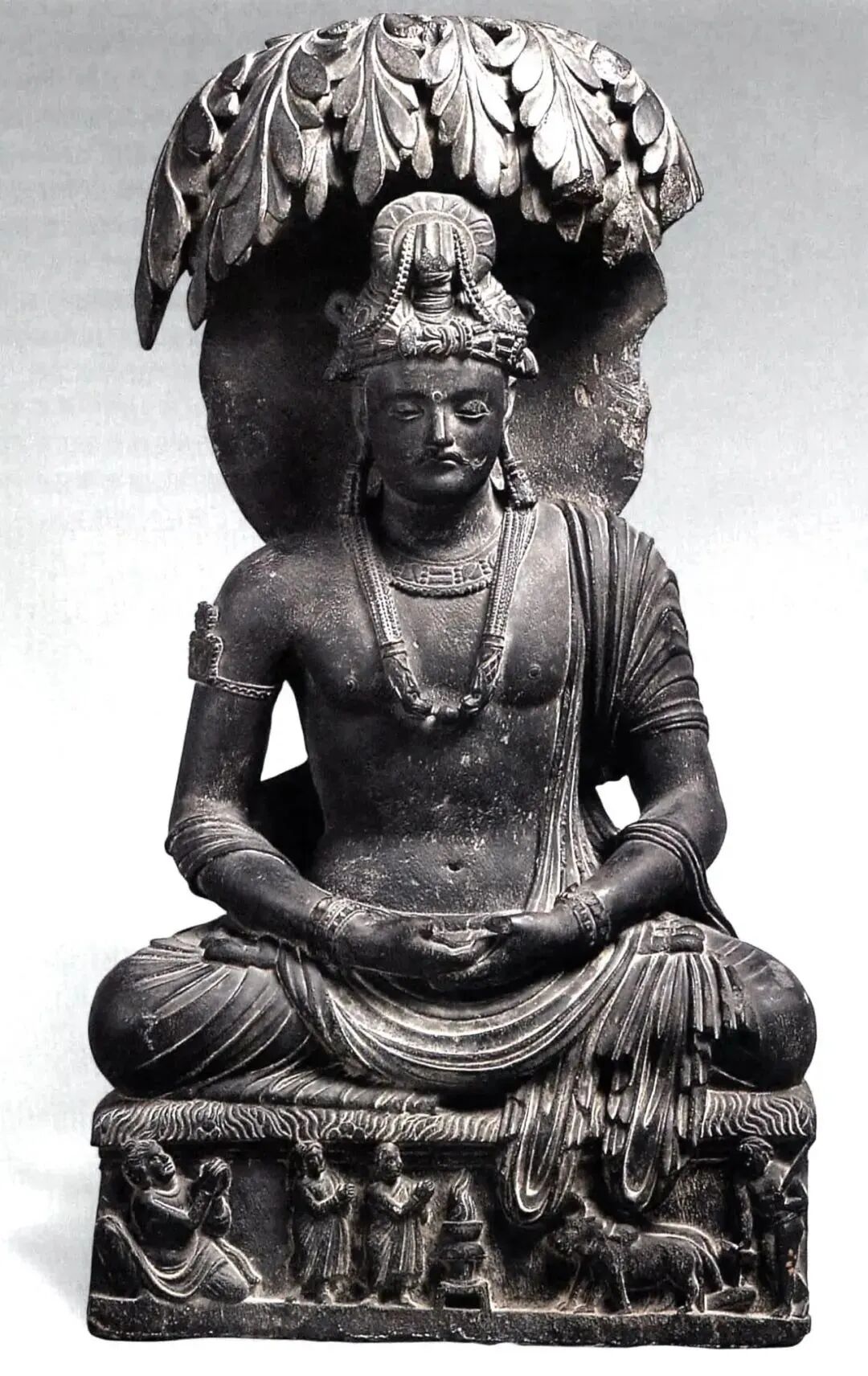 说罢,悉达多太子心中思忖:若不剃除须发乃非出家,即拔金刀,手自削发,且发誓言:“我今剃除须发,愿与一切众生断除烦恼习障。”这时来了一个猎人,身着袈裟,太子就以身上的华丽服饰相换,完全成了僧人形象。