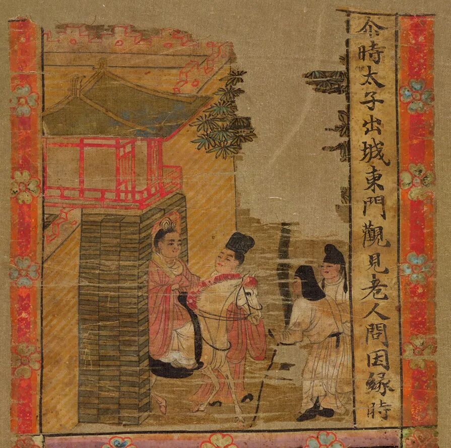 幡画未画出的还有太子出西门、北门。太子出西门,天神化作死人,“扶舆出城,室家随车,啼哭呼天,奈何捨我,永为别离。”太子叹曰,看到生老病死的现状,当知人生无常,我亦不可幸免。太子复出北门,天神化为沙门,着法服持钵,步履安详。太子见此欢欣,决心出家,永离生老病死。