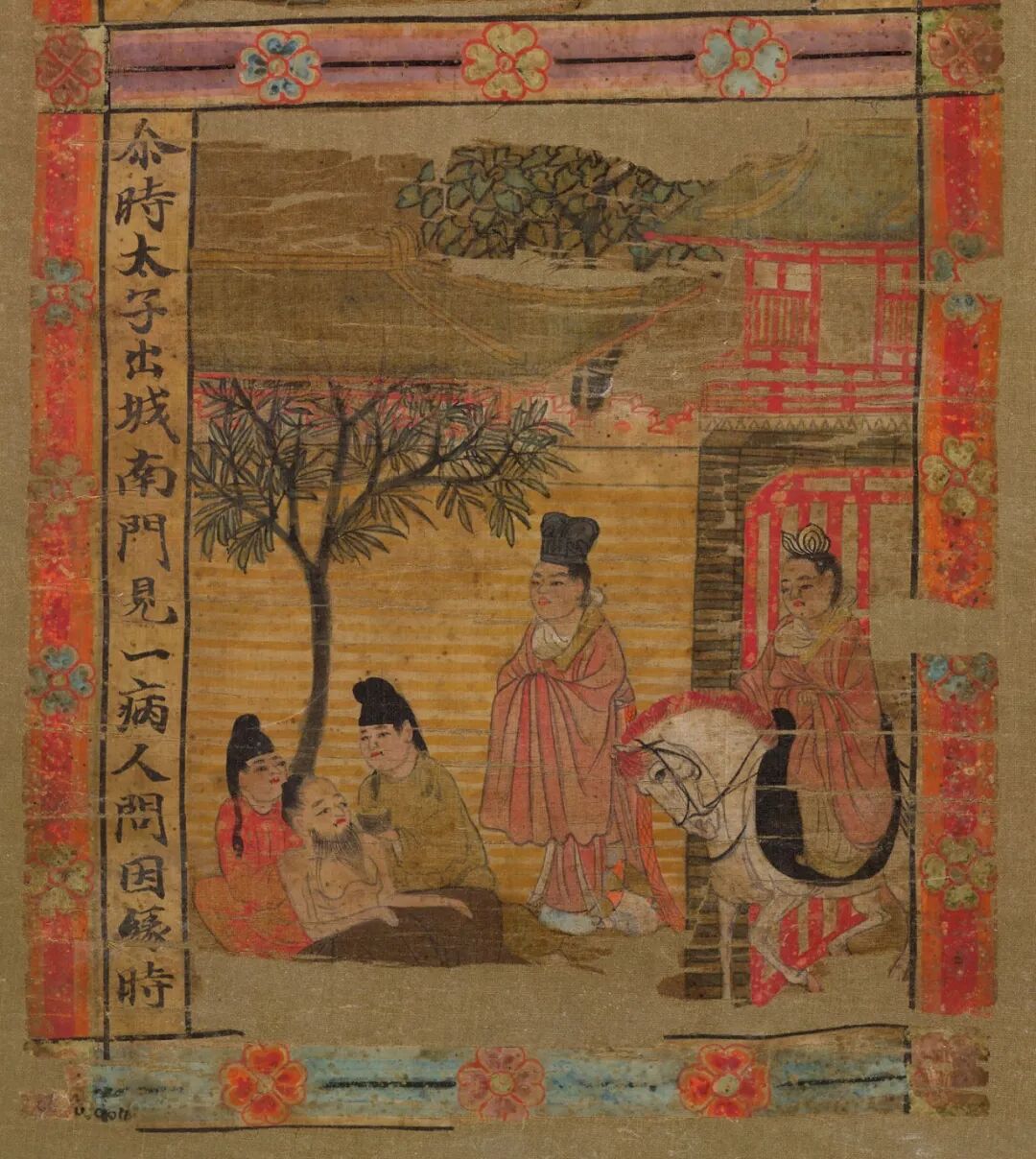 佛传画幡《佛传故事之出游四门》,藏经洞出土,编号1919.0101.0.88,绢本着色。现存大英博物馆。画幡两个画面,描绘太子出东门和出南门的两个场景。